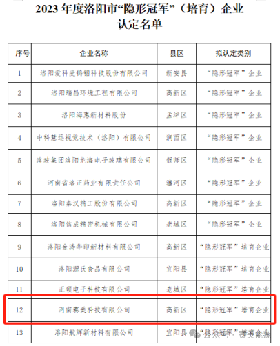 为加强企业培育力度,引导企业走专业化、精细化、特色化、新颖化发展之路,洛阳市工业和信息化局组织开展2023年度洛阳市“隐形冠军”(培育)企业认定评选工作,经过县区推荐、科室审核、实地考察以及市工信局党组会研究,洛阳爱科麦钨钼科技股份有限公司等8家企业被认定为2023年度洛阳市“隐形冠军”企业,河南赛美科技有限公司等11家企业被认定为2023年度洛阳市“隐形冠军”培育企业。